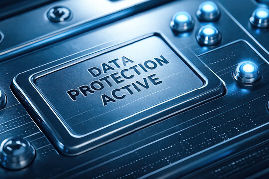 Data protection security technology cybersecurity encryption server blue metallic button circuit