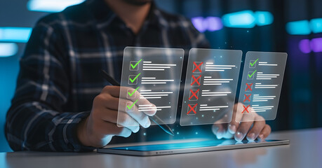 Businessman use pen digital tablet review electronic files, utilizing intelligent management system to validate records and streamline final approvals, Digital document workflow and quality assurance