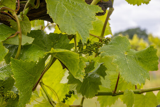 Grapes developing on a vine in a Sussex vineyard, in early summer