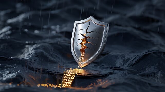 Ancient metallic shield with ornate engraving and glowing golden light emanating from its base on a dark textured surface