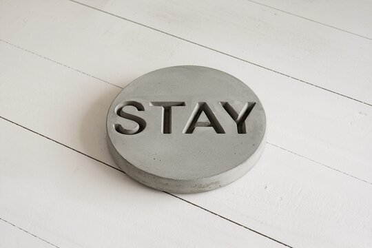 Concrete disc with engraved 'STAY' text on white wooden floor