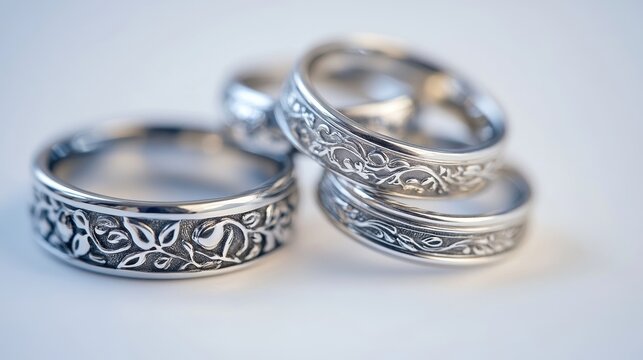 A set of minimalist silver rings with engraved patterns on a white isolated background