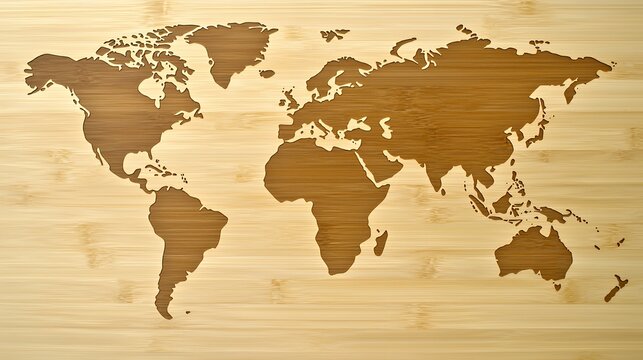 World map engraved into wooden surface, soft warm light, rich brown hues, and rustic handmade aesthetic, close-up shot.