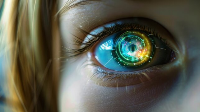 Close-up eye with green tech interface