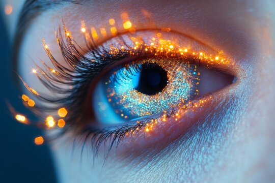 Close-up of an eye with futuristic glowing cybernetic details