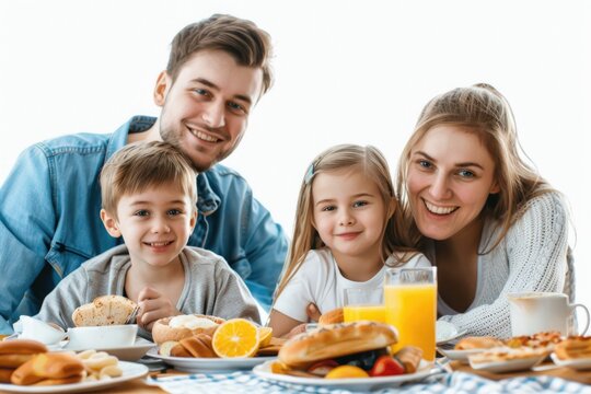 A family enjoying breakfast together, with a variety of foods on the table