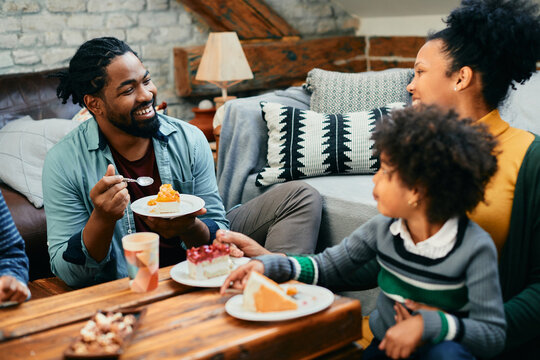 Happy black family enjoys while eating cake and talking at home.