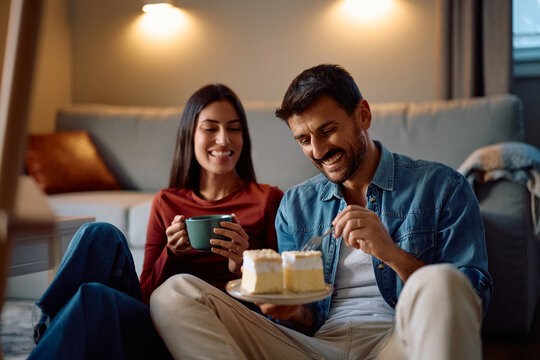 Happy couple enjoying in dessert while relaxing at home.