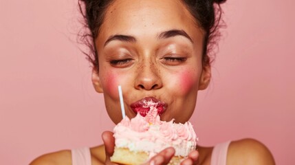 A woman with closed eyes enjoying a bite of a pink frosted cake with a white candle against a pink background.