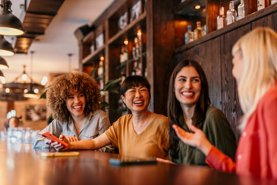 Joyful friends enjoying conversation in trendy cafe scene