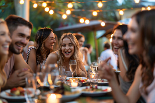 Summer garden party. Happy friends clinking glasses with wine on summer terrace of cafe or restaurant. Friends and neighbors Enjoying Outdoor Picnic In Garden and toasting on garden party at sunset