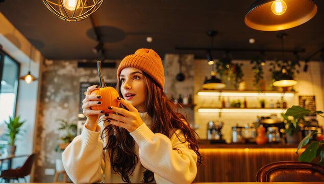 Stylish person enjoying pumpkin spice latte in trendy cafe, autumn fashion, warm amber lighting, authentic moment, seasonal beverage, contemporary interior design