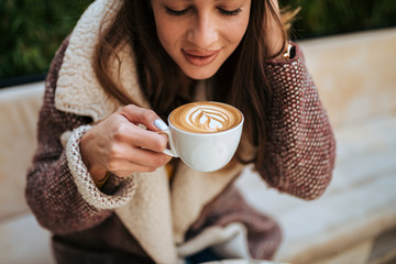 Young woman enjoying latte art coffee.