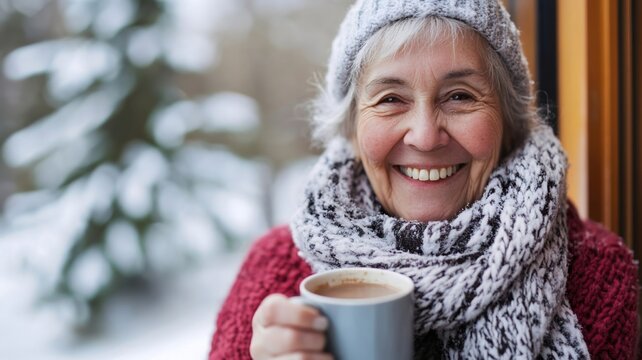 Happy senior woman wrapped in a warm knitted scarf enjoying a cozy winter moment with hot cocoa