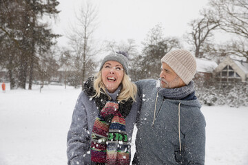Young couple standing near big window and looking outside, enjoying winter holidays.