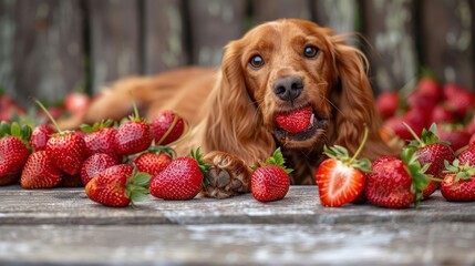 A playful dog enjoying strawberries on a rustic wooden surface surrounded by fresh fruit