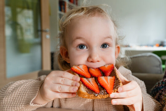 Blond boy eating toasted bread with strawberries at home