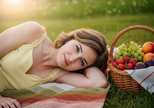 Relaxed young woman lying on picnic blanket in summer meadow beside wicker basket filled with fresh fruit, enjoying peaceful outdoor leisure and warm golden evening sunlight