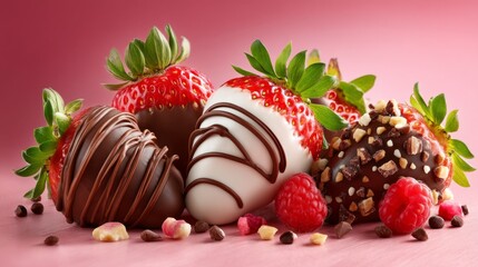 Colorful strawberries take center stage as they gleam with rich chocolate coatings and crunchy toppings. The scene evokes a tempting allure, perfect for sharing or enjoying alone