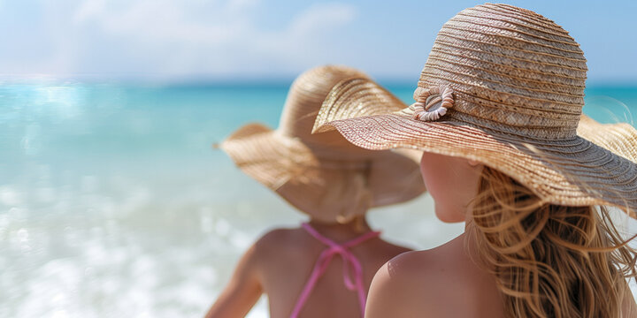 Two girls are sitting on the beach, wearing straw hats and bathing suits. Scene is relaxed and carefree, as the women are enjoying their time by the water