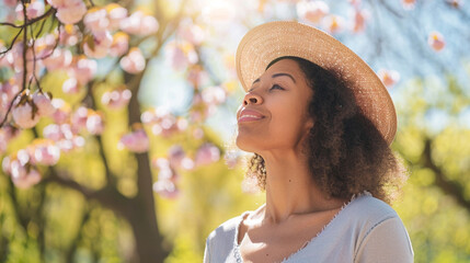 A happy young woman smiles in the cold winter weather, her breath visible in the frosty air. Portrait of a person enjoying the outdoors in the snow. Copy space