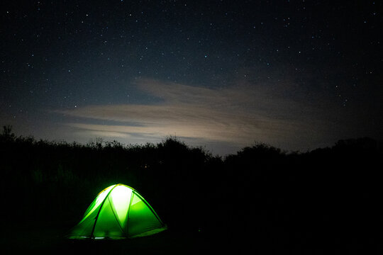 Many hanging small warm white color LED lights in the little sphere empty glass to enlighten the night beside the wall