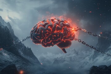 Demon horns with metal chains and fiery embers in infernal landscape