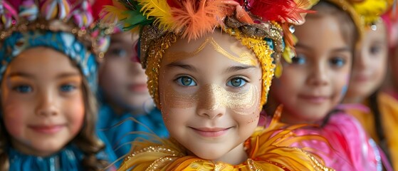 Children in colorful costumes celebrate Purim with singing and dancing at a Mardi Gras masquerade party. Concept Culture & Tradition, Festive Costumes, Celebration Activities, Masquerade Party