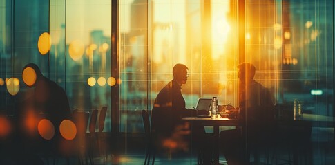 business, office, blur, interior, abstract, indoor, meeting, background, blurred, discussing. two silhouettes of businessmen in a modern office discussing further and new deals business. Generative Ai