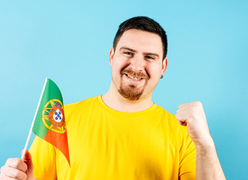 Enthusiastic Fan With Portugal Flags Cheering Images