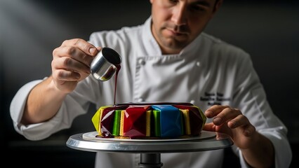 Male pastry chef glazing futuristic 2026 entremet cake with mirror glaze, dark neutral pastry kitchen background, dessert photography for premium patisserie branding and modern culinary editorials