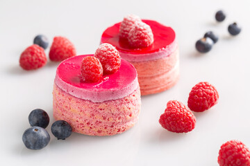 Strawberry vanilla layered entremet dessert on pastel-colored pedestal. Modern cake with fresh strawberries
