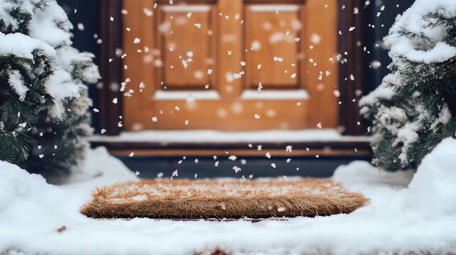 Snow-covered doormat at front door, winter entryway with rug, black rubber mat for protection, snowy doorway scene, holiday season exterior of home.