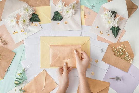 Woman at table with many envelopes and floral decor
