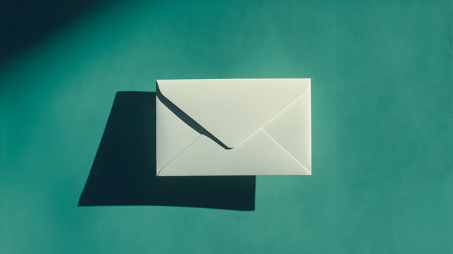 A minimalist white envelope placed on a moody teal background with dramatic lighting. Ideal for branding, wedding invitations, or corporate stationery mockups.
