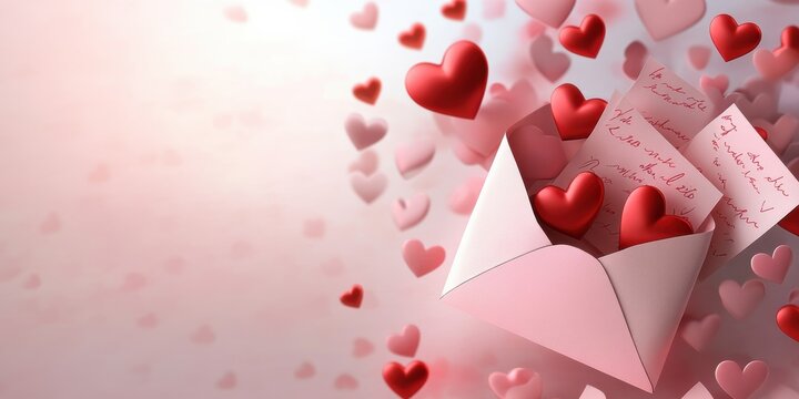 A charming Valentines Day scene features an open envelope bursting with red hearts and romantic notes, symbolizing love and affection, ideal for a joyful, intimate date celebrating two lovers