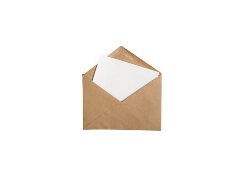Brown envelope front with card inside isolated on white background. Letter top view. Object with clipping path