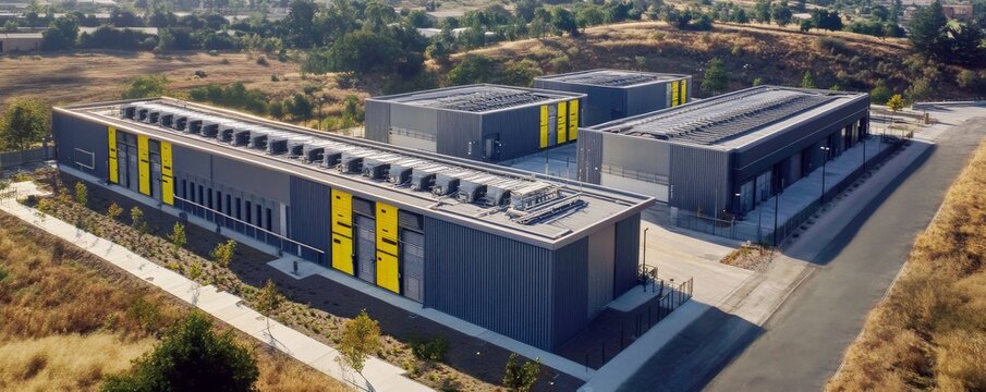 Aerial view of modern data center complex with solar panels, surrounded by trees and fields