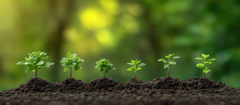 Growth and investment concept featuring a series of green plants in soil, arranged left to right, set against a blurred nature background with soft bokeh.