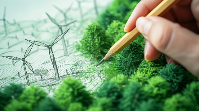 A close-up of a hand drawing wind turbines on paper, representing the concept of green energy and environmental innovation.