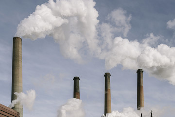 Colorful clothes pile emits yellow smoke, fast fashion impact on eco. Wardrobe of garments hanging on rack. Pollution, environmental issues, waste management concerns highlighted. Climate change