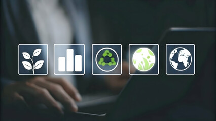 Green and eco friendly icons floating in an interactive dashboard to represent sustainability metrics in environmental monitoring concept as Green eco friendly icons on an interactive dashboard showca