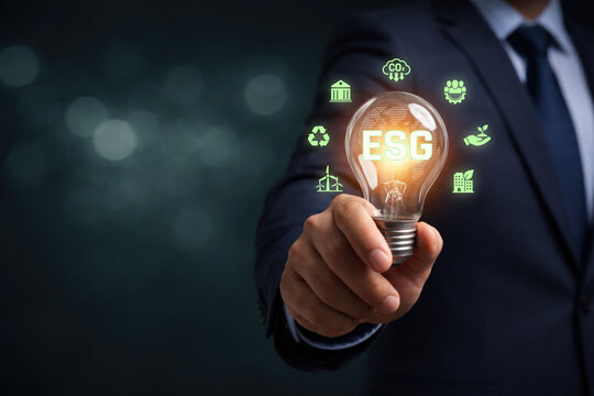 Businessman holding glowing ESG icon representing environmental social governance sustainability responsible business innovation and corporate responsibility concept