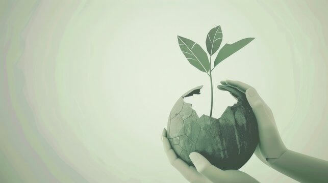 A conceptual visualization of hands nurturing a green plant emerging from a cracked globe, set against a backdrop of plain white, symbolizing environmental restoration and sustainable practices