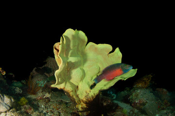 A fish rests on a beautiful yellow coral at the bottom of the sea.