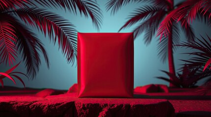 A vibrant red package rests on a rocky tropical platform.