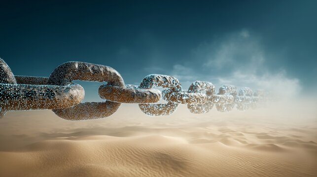 Blockchain link sand dissolve digital technology desert futuristic concept security. Blockchain links dissolving into sand desert symbolizing digital transformation and ephemeral nature