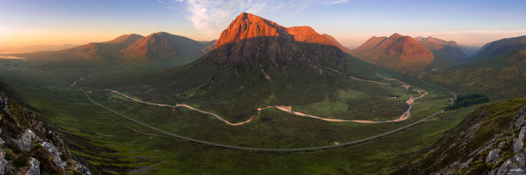 Ultra wide panoramic view of mountain range at sunrise. The Buachaille, Glencoe, Scottish Highlands. A meandering river and long curving road can be seen in foreground of landscape.