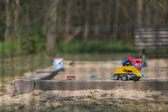 Germany,ÔøΩBrandenburg, Toys left in sandbox of empty playground during COVID-19 epidemic