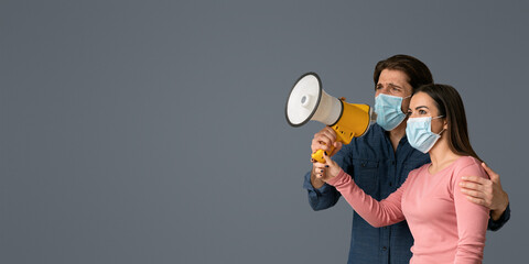 Emotional couple wearing medical masks and shouting with megaphone at copy space over light background, panorama